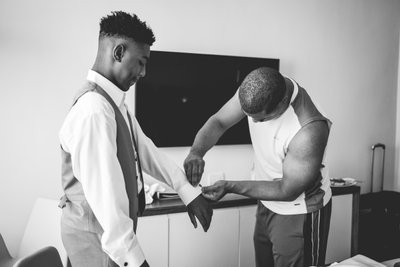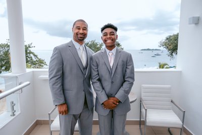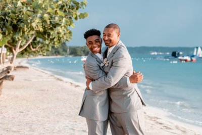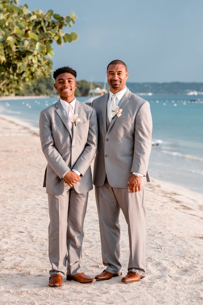 The groomsmen portraits had their own warmth. Devon and his son stood on the shoreline in matching grey suits, arms wrapped around each other in a full embrace, the son’s grin practically eclipsing the Negril afternoon. This image deserves its own wall. It is not a wedding photo so much as a declaration: these two are the kind of father and son that people aspire to be.