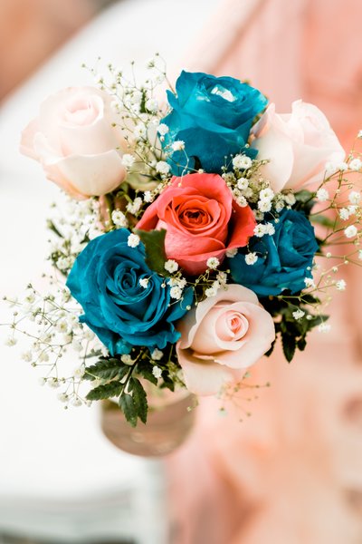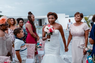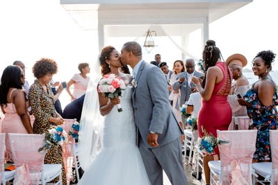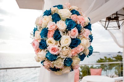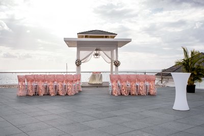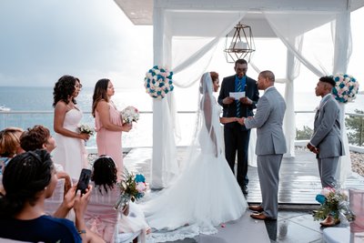 The ceremony took place on an elevated terrace at Azul Beach Resort Negril, overlooking the Caribbean Sea with the kind of view that makes you wonder why anyone ever gets married indoors. The altar was draped in white fabric that billowed softly in the ocean breeze, flanked by arrangements of teal, blush, and ivory blooms—colors that would become the visual heartbeat of the entire day.