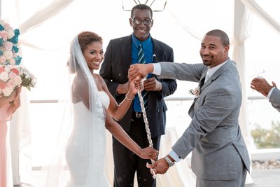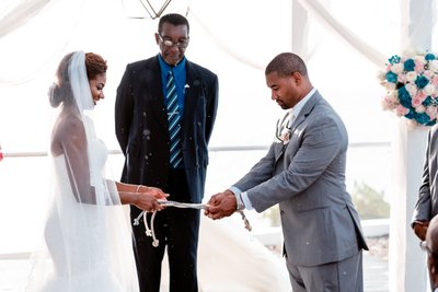 One of the most striking ceremonial moments of the day was the rope-tying ritual. Kellyn and Devon each held one end of a thick rope, its ends decorated with small ornamental tassels, and together they worked to tie the knot between them—a physical enactment of the union they were making. The officiant watched with his eyes cast downward in something like reverence as rain began to fall softly around them, catching in the light like scattered diamonds.