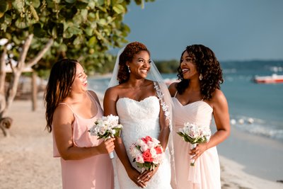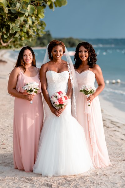 The beach portraits brought an entirely different atmosphere: sunlight, sand, the turquoise shimmer of the Caribbean. Kellyn’s two bridesmaids stood with her in their blush gowns—one in a flowing spaghetti-strap style, the other in a strapless ruched design—each carrying a bouquet of white and pale rose blooms. All three women are laughing, caught mid-conversation, completely unaware of how beautiful they look in that exact moment.