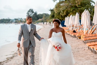 The resort’s elevated rooftop terrace offered a ceremony space with an unobstructed view of the Caribbean Sea, open to the sky and the breeze and whatever the weather chose to bring. The lush tropical gardens, maintained with evident care, offered a ready-made paradise for first look and portrait sessions. The beach, long and clean and kissed by the warm waters of Negril Bay, transformed seamlessly into both a reception venue and a backdrop for some of the most stunning sunset photography imaginable.