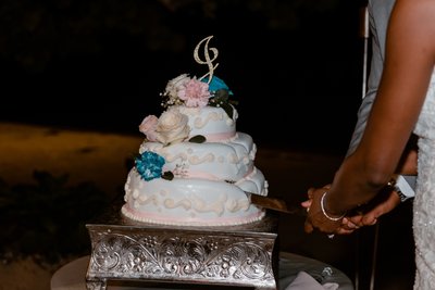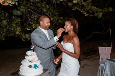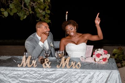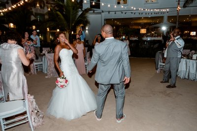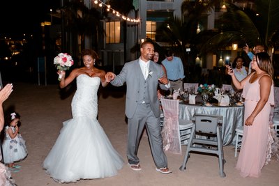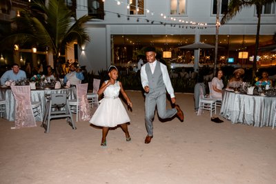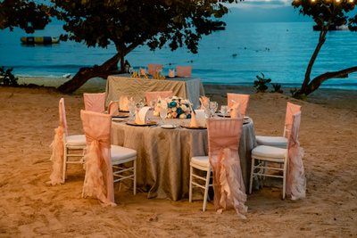 The reception at Azul Beach Resort Negril was held on the beach itself, with round tables draped in silver linen and blush chair sashes arranged in a warm semicircle. String lights stretched overhead from the hotel building to the palm trees, casting a honeyed glow over the sand. Centerpieces of teal and blush flowers added color and height to each table. The ocean was just steps away. The air smelled of salt and frangipani.