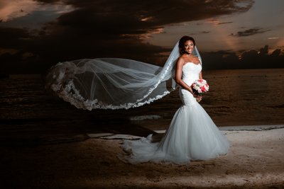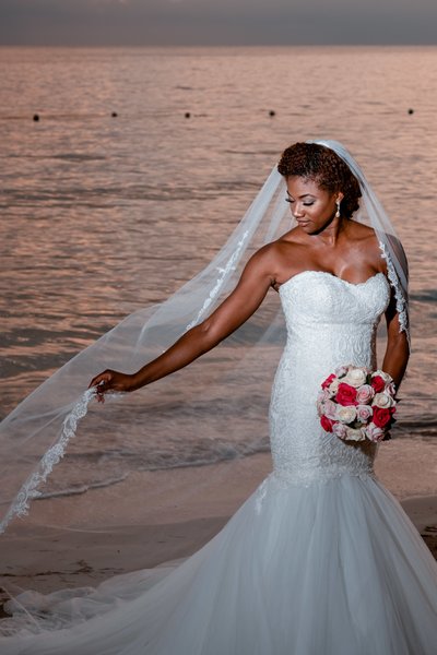 As the sun dropped toward the horizon and the sky above Azul Beach Resort Negril turned from gold to amber to deep, bruised rose, Kellyn returned to the beach for one final bridal portrait—and the result is the photograph of the entire collection. She stands on the sand in her fitted lace gown, her bouquet in hand, while her cathedral veil streams dramatically behind her, lifted by the evening wind into a perfect arc of lace and light. Above her, storm clouds gather in shades of charcoal and rust, their texture and drama acting as a natural backdrop that no studio could recreate.