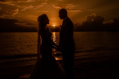 And then there was the kiss at sunset. Kellyn and Devon stood at the water’s edge as the sun dipped below the horizon, the entire sky behind them transforming into a burning canvas of orange and crimson. The camera captured them in pure silhouette: her veil trailing into the water, his hands in hers, their faces turned toward each other, foreheads almost touching, lips meeting. The Caribbean Sea stretches behind them. The sky is on fire.