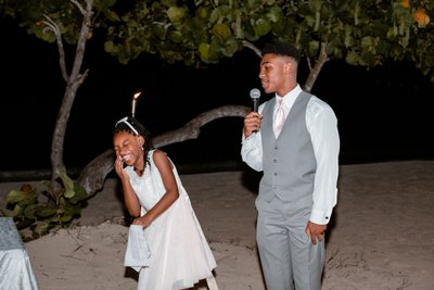 One of the most moving moments of the reception was Devon’s son taking the microphone to deliver a toast. Standing on the sand with the torchlight behind him, he spoke into the mic while his younger sister stood beside him, her hand over her mouth to contain her laughter at whatever it was her brother said. The guests leaned in. The son’s expression was earnest and confident in the way only teenagers can be when they have something real to say.