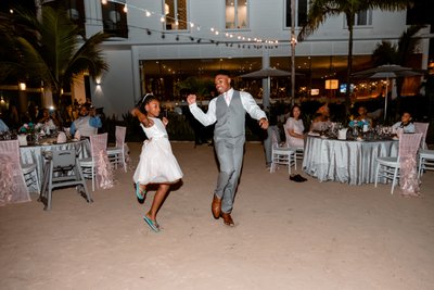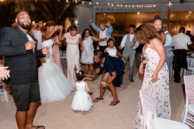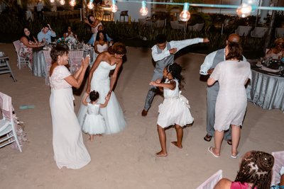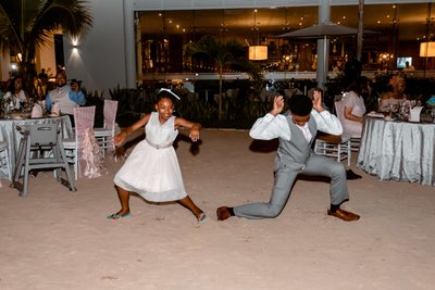 Before the bride and groom made their entrance, Devon’s son and daughter—already dressed in their coordinating wedding attire—burst onto the sand dancing. The son in his grey vest and pink tie, the daughter in her white flower girl dress and teal flip-flops, they ran and jumped and danced their way through the crowd with the kind of full-body joy that adults have usually learned to contain. The guests watched them with delight. Every phone in the place went up.