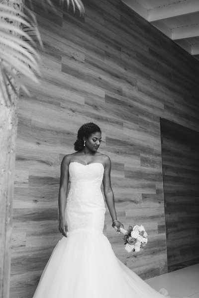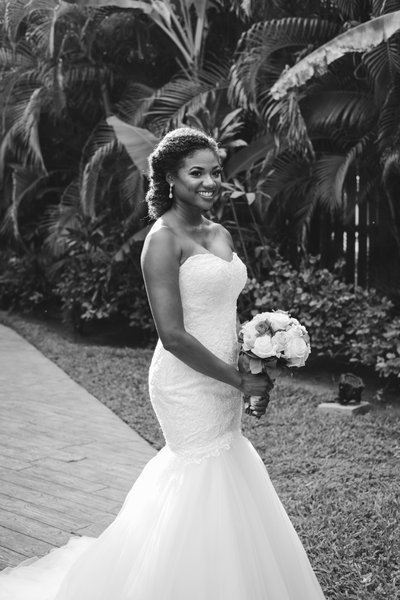 The bridal portrait taken just before this moment is extraordinary on its own terms. Kellyn stands alone on a garden path, palm trees arching overhead, her dress catching the warm Jamaican light, her gaze lifted just slightly to the side—composed, radiant, and completely herself. Azul Beach Resort Negril’s tropical grounds provide a backdrop that no studio could ever replicate.