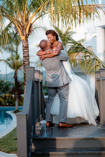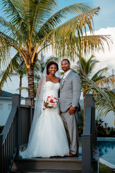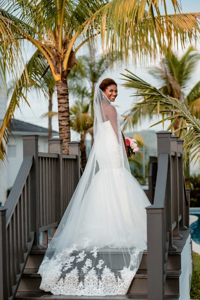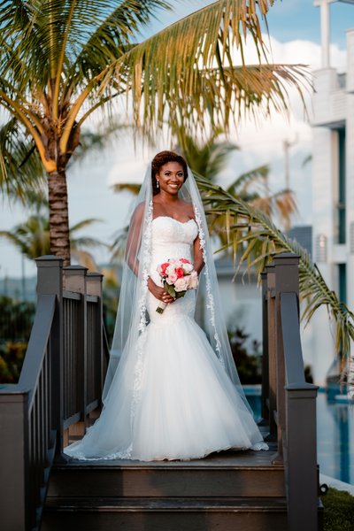 Following the ceremony, Kellyn and Devon moved through the Azul Beach Resort Negril grounds for their couple portraits, and the resort’s architecture provided a series of stunning backdrops. One particularly striking image places them on a wooden bridge at golden hour, twin palm trees framing them against a sky of deep blue and rolling clouds. Kellyn’s cathedral-length lace-trimmed veil catches the wind. Devon’s arm wraps around her shoulders. They look like the cover of a novel you’d read in a single sitting.