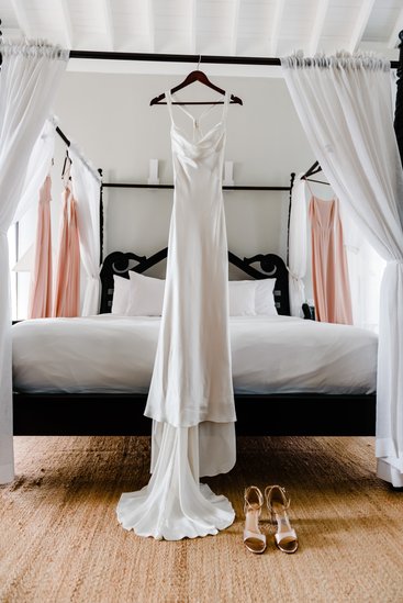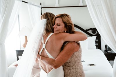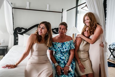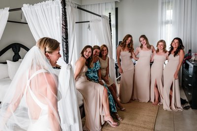 The canopied bed, draped in white linen curtains and set against soft sage walls, created the most effortlessly chic backdrop for the morning prep photos. Champagne flutes glinted on the nightstand. Hair was perfectly tousled. And every single person in that room was beaming. This is what it looks like when a bride is surrounded by her people.