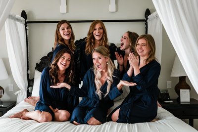 The image of all five women gathered on that bed, wide-eyed and laughing with their hands outstretched as if to say “look at this ring, look at this day, look at this life!” is one of those photographs that will live on a wall for decades. There’s no staging that kind of joy. You either have it or you don’t — and this bridal party absolutely had it in spades.