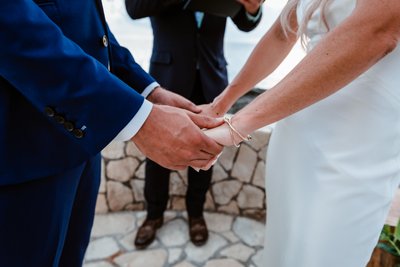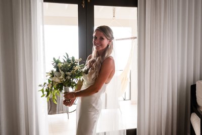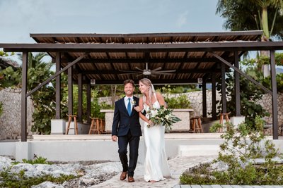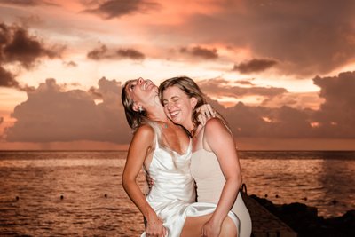 In the couple’s portraits against the sunset, there is a sense of arrival — of two people who have reached the place they were always heading toward. Standing on the stone pier as the sky blazed around them, Cara and Austin faced the camera together: her in front with her bouquet of tropical whites and greens, him behind her with his hand at her waist, both of them smiling with the ease of people who are exactly where they want to be.
