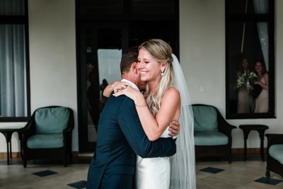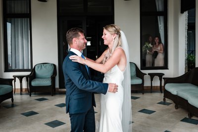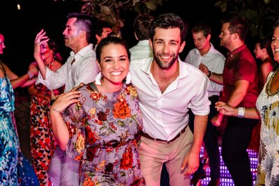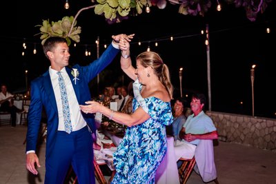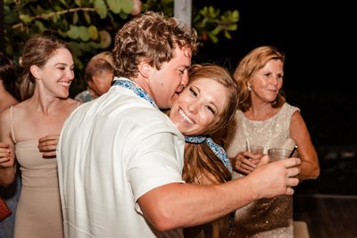 They swayed close as a violinist played beside them, his bow moving in long, sweeping arcs, the melody drifting out over the dark Caribbean beyond. String lights hung between the trees overhead, and guests gathered in a loose circle at the edge of the dance floor, drinks in hand, watching the couple move through their first dance as husband and wife. The mothers and fathers looked on with the particular expression that parents wear at these moments — pride so large it requires a new word.