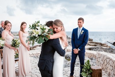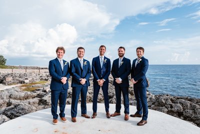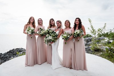 The blush of the bridesmaids’ gowns against the navy of the suits created a palette that felt simultaneously tropical and timeless — soft pinks and deep blues against grey rock and green palm fronds. The white lilies and eucalyptus of the bouquets added a fresh, organic note. It was a portrait that managed to feel both editorial and completely, warmly human.