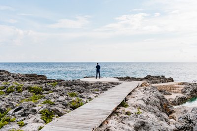 Whatever was passing through his mind in that moment, the photograph speaks volumes: here is a man who understands the weight and the wonder of what is about to happen. The weathered wooden boardwalk leads the eye straight to him, the rocky volcanic limestone frames him on either side, and the blue horizon stretches endlessly ahead. It is the kind of image that makes you feel something without quite knowing why.