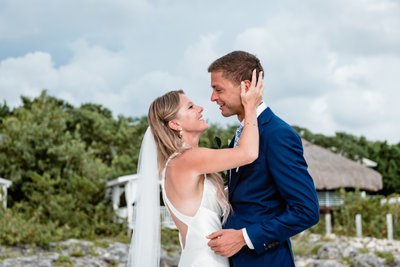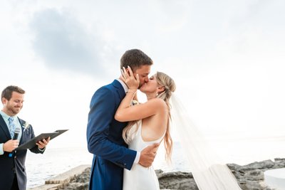 And then: the kiss. Backlit by the silvery Jamaican sky, the officiant smiling beside them, Cara and Austin shared their first kiss as husband and wife with their hands on each other’s faces — the most tender and intentional of gestures. She pulled him in. He wrapped his arm around her waist. And for one suspended moment, the entire universe was just the two of them.
