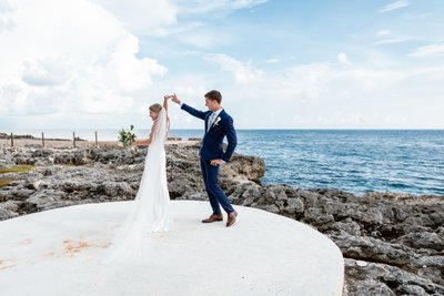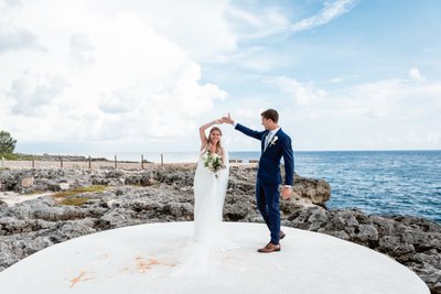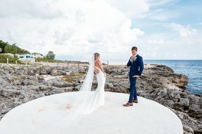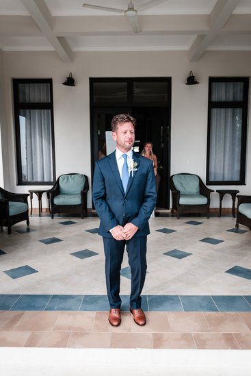 While Cara was getting ready inside, Austin found his moment of stillness on the cliffs. In one of the most quietly powerful images of the day, he stands alone at the edge of a concrete platform — a tiny figure against the vast expanse of the Caribbean Sea — suited in navy, hands clasped, head bowed. He could be praying. He could be steeling himself. He could be making promises to himself and to the universe.