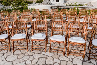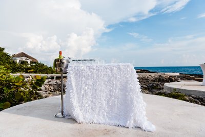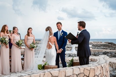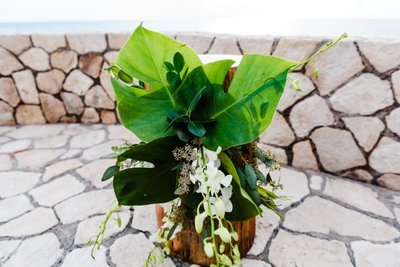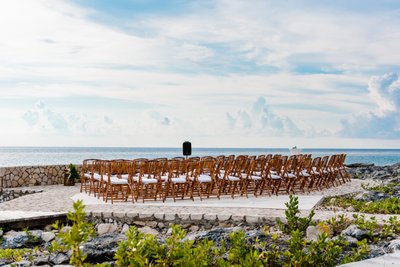 The ceremony space at The Cliff Hotel is, without exaggeration, one of the most breathtaking wedding venues in the Caribbean. A raised stone platform, constructed from natural limestone, extends over the rocky coastline with an unobstructed view of the open sea. Bamboo chairs lined both sides of the aisle. Log stumps served as altar decoration, topped with lush tropical greenery. The sky overhead shifted from bright afternoon blue to dramatic storm cloud grey as the ceremony progressed — nature providing its own kind of theatrical backdrop.