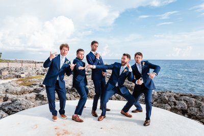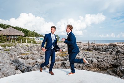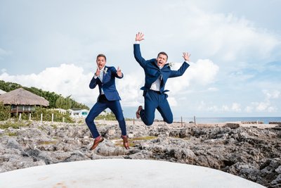 If the bridesmaids’ portraits were all warmth and tenderness, the groomsmen brought pure, unapologetic energy. In what may be the most exuberantly joyful photograph of the entire day, two of the groomsmen launched themselves skyward from the ceremony platform, arms flung wide, faces stretched into ecstatic screams. The ocean glittered behind them. The Jamaican sky bloomed with clouds. And these two men were absolutely, completely, gloriously airborne.
