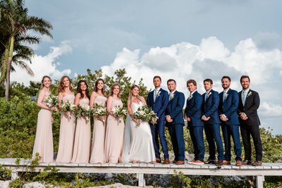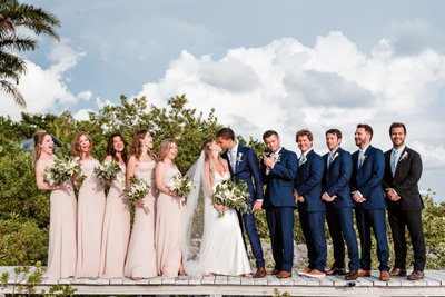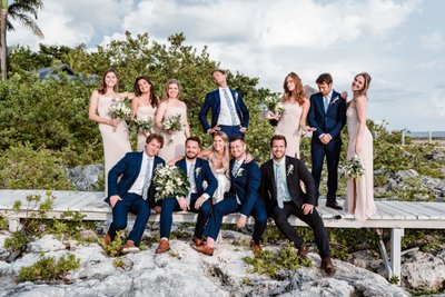 The full wedding party portrait was staged on the wooden boardwalk that winds through the limestone landscape — a setting that feels like it was designed by a set decorator with exquisite taste. The groomsmen sat casually along the edge of the dock, legs dangling, while the bridesmaids and couple stood behind them. Someone was pointing at the sky. Someone else was pulling a dramatic pose. Cara was laughing so hard she was practically glowing.