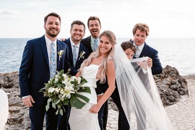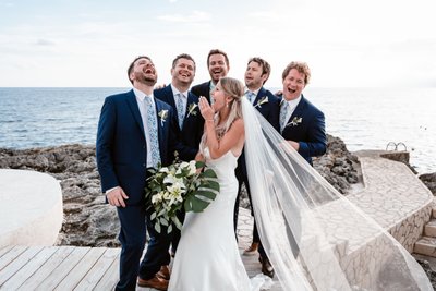 One of the unexpected delights of the portrait session was the photograph of Cara surrounded by the five groomsmen against the oceanfront backdrop. All five men looked skyward in varying states of theatrical rapture while Cara — holding her spectacular bouquet of calla lilies and monstera leaves, her veil catching the sea breeze — laughed with her hand over her mouth. The veil swept out dramatically to one side, adding a painterly sweep to the whole composition.