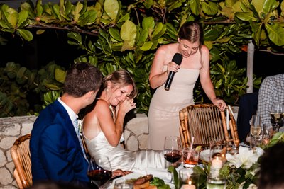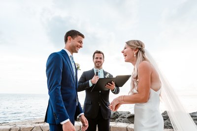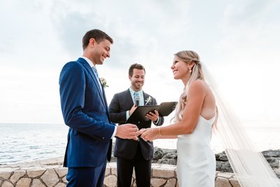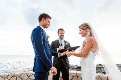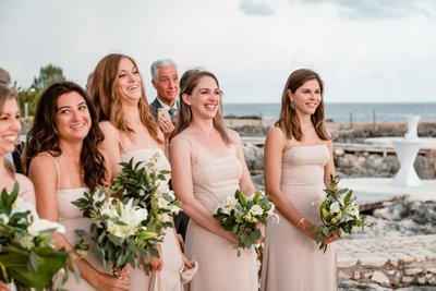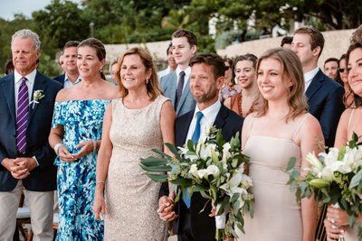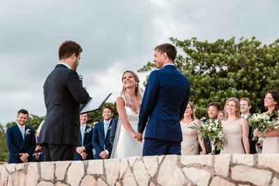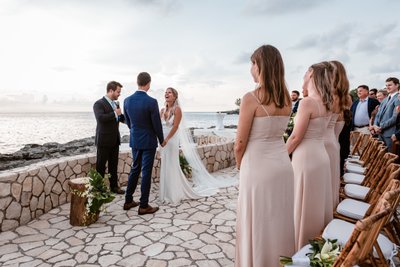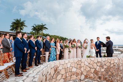 The wide-angle photograph of the full ceremony tells the whole story: guests standing in rapt attention, the wedding party assembled at the altar, Cara and Austin facing each other at the edge of the world with the Caribbean stretching endlessly behind them. It is the kind of scene that makes you wish you’d been there — and deeply grateful to the photographer for capturing it.