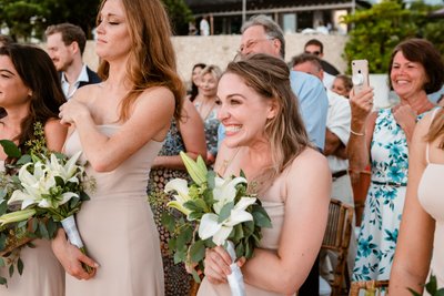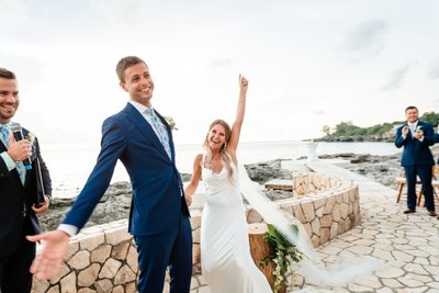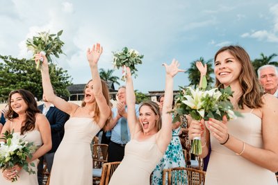 The moment the ceremony concluded, the bridesmaids erupted. Arms shot skyward. Bouquets were thrust into the air. One bridesmaid threw both hands up in an unbridled expression of victory and joy — because that’s what it felt like. A victory. A celebration not just of a wedding, but of love winning, of two people finding each other, of all the years and choices and moments that led to this sun-soaked afternoon on a Jamaican cliff.
