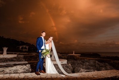 And then, as if the sunset weren’t enough, a rainbow appeared. Arching over the rocky coastline against the dramatic storm-lit sky, it showed up exactly the way magic tends to: unannounced, unnecessary, and absolutely unforgettable. Cara and Austin stood on the rocks with the sea behind them, grinning at the camera, a rainbow emerging from the clouds above their heads as if placed there by a particularly enthusiastic set designer.