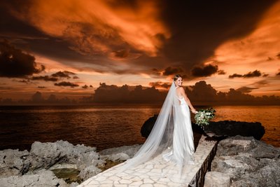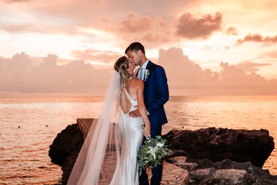 The colours are almost unreal: deep navy suit against the orange-red sky, white dress and veil against the glowing sea, the green of tropical bouquet foliage cutting through like a reminder that this is a living, breathing, wildly beautiful place. These portraits look like paintings. They look like the kind of images you frame and hand down through generations.