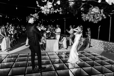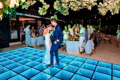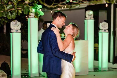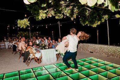 As darkness fell over the Negril coastline, the reception at The Cliff Hotel came alive with light and music. The centerpiece of the outdoor reception space was a LED infinity dance floor — a glowing green grid of mirrors that reflected endlessly downward, creating the illusion that Cara and Austin were dancing above a bottomless sea of light.