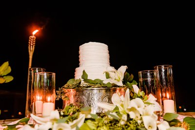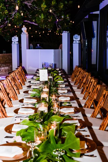 The atmosphere was lush, tropical, and effortlessly romantic: overhead, the gnarled branches of sea grape trees formed a natural canopy, their wide leaves catching the warm light. The whole scene felt both extravagant and intimate — a private world created for this one night, for these two people.