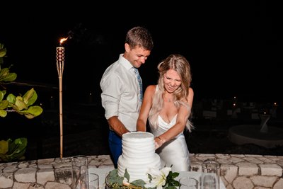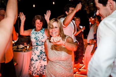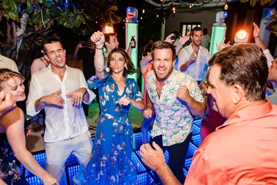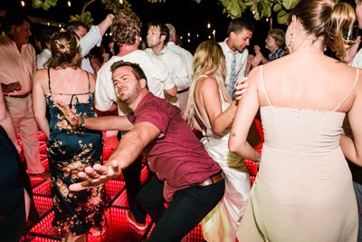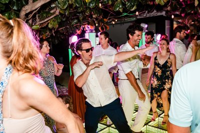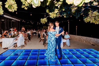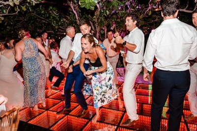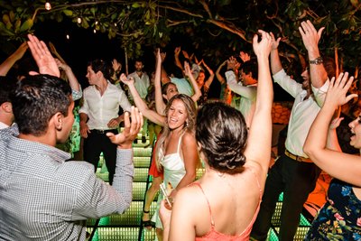 The guests ranged in age and background but were united in one mission: to celebrate Cara and Austin as loudly and enthusiastically as possible. The dance floor photograph, shot from inside the crowd, captures the energy of a reception that was heading nowhere but up. Hands reach toward the canopy of sea grape branches. The green infinity floor glows beneath them. The night beyond is warm and dark and Caribbean.