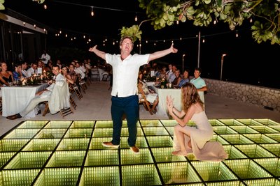 By the time the night was fully underway, the LED dance floor had become a full-scale celebration. Arms were raised. Hips were moving. The bride, no longer in her veil, was in the thick of it — grinning, spinning, leading the charge with the particular authority of a woman who has been waiting all day to truly let go.