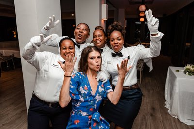 One of the most charming photographs of the entire reception features the staff of The Cliff Hotel’s Zest restaurant — four members of the service team in their crisp white uniforms and white gloves — gathered around a delighted guest, all five of them striking their most glamorous poses for the camera. The energy is entirely contagious. Hands up, fingers spread, expressions ranging from regal to ridiculous.