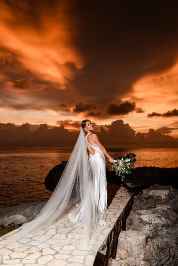 Jamaica has a reputation for dramatic sunsets, but the sky that descended over The Cliff Hotel on Cara and Austin’s wedding evening was something else entirely. The clouds ignited in shades of deep copper, burnt orange, and smoldering crimson, turning the sea below into a mirror of fire. It was the kind of sunset that makes you pull out your phone and then immediately put it away again, because you know the camera cannot possibly do it justice.