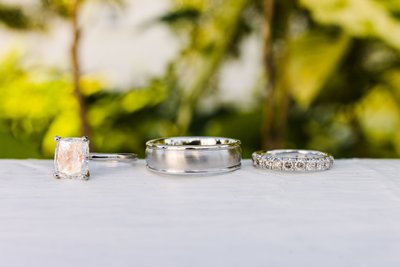 Wedding mornings have a magic of their own, and Marina and John's was no exception. While Marina and her nearest and dearest gathered in a beautifully appointed suite at Half Moon — laughing, champagne flutes in hand, exchanging heartfelt gifts — John was getting styled and suited up in his own world of pre-wedding prep. The detail shots told their own story long before the ceremony began: a stunning pair of crystal-encrusted Badgley Mischka heels, two gold wedding bands nestled side by side in a blue velvet ring box, delicate pearl earrings, a gold leaf headpiece, and a dainty diamond necklace. Everything was laid out with care, each piece a small symbol of a bigger promise about to be made.