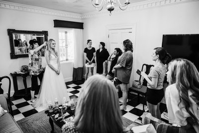 One of our favorite getting-ready moments was the gift exchange, captured in a joyful photograph of Marina — already radiantly beautiful in her gown — receiving a white gift bag from one of her closest friends, the whole bridal party beaming around them. In that one image you can feel the electricity of the day: the sisterhood, the shared excitement, the quiet acknowledgment that everything was about to change in the most wonderful way.