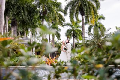One of our absolute favorite portrait setups of the day was photographed through a curtain of tropical foliage, with Marina and John framed by the lush greenery and the still waters of the estate pool in the foreground, the soaring palm trees reaching up behind them. Shot from a low angle through the plants, it feels like stumbling upon a secret — two people in their own world, completely absorbed in each other. It is cinema-worthy.