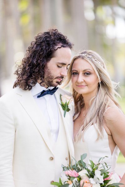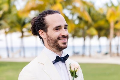 The first-look portraits that followed were absolutely dreamy. Marina in her elegant, understated A-line gown with a flowing tulle skirt and delicate spaghetti straps looked effortlessly beautiful against the tropical backdrop. John, dashing in his cream double-breasted three-piece suit with a navy bow tie and a blush boutonnière, was the picture of a man completely smitten. Together, they were stunning — natural, joyful, completely in their element.