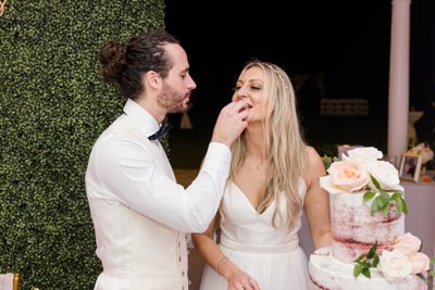 The floral arrangements throughout the reception deserved their own standing ovation. Centerpieces of peach, blush, coral, and ivory blooms on gold Chiavari chairs and white-linened tables created a warm tropical elegance that felt perfectly of-the-place without being over-the-top. The overall aesthetic of the wedding — the cream and white wedding attire, the tropical florals, the relaxed-glamour venue — came together so cohesively, and it was clear that every element had been thoughtfully chosen.