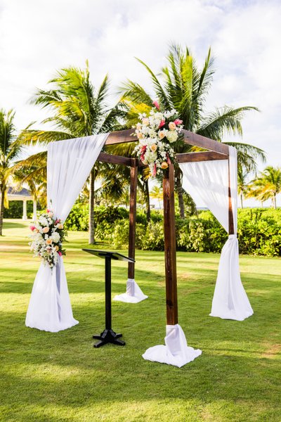 Half Moon's outdoor lawn ceremony space is genuinely one of the most breathtaking venues in the Caribbean, and it showed up magnificently for Marina and John's big moment. Set against a backdrop of swaying coconut palms and the deep blue of the Caribbean Sea in the distance, the ceremony space was dressed simply but beautifully — a wooden arbor draped in flowing white fabric and adorned with cascading arrangements of blush, coral, and ivory blooms created the most romantic altar. White folding chairs were arranged in neat rows on the immaculate green lawn, each one filled with guests who had traveled from near and far to witness this union.