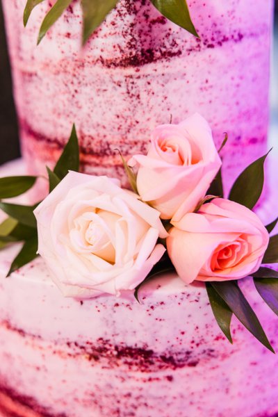 The cake cutting had its own gorgeous energy — Marina and John standing together in front of a stunning two-tiered naked red velvet cake adorned with fresh blush and ivory roses and greenery, their expressions focused and a little giddy. Against the lush green hedge wall backdrop, it made for a beautifully composed photograph that is equal parts editorial and deeply personal.