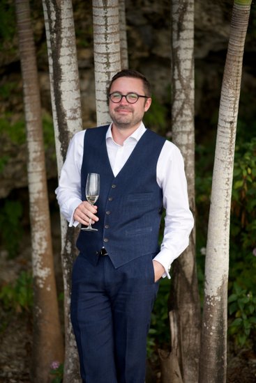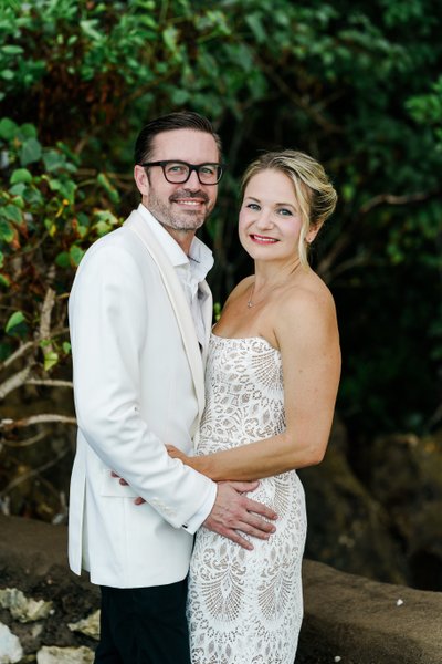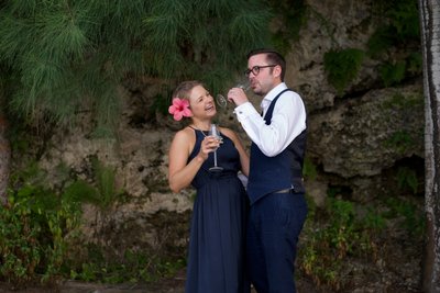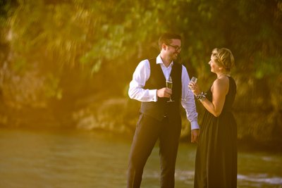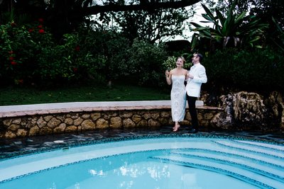 As the light faded toward dusk, Xenia and Justin moved to the poolside — a curved turquoise pool set against a backdrop of flowering red ixora and dense tropical plantings. Standing at the pool's edge with drinks raised and faces turned upward in shared laughter, they look entirely unselfconscious, caught mid-celebration. The moody blue-hour light gives the image a depth that contrasts beautifully with the warmth and joy of the subjects. The reflection of their figures in the still water below adds a layer of visual interest that elevates the composition further.