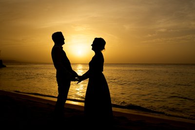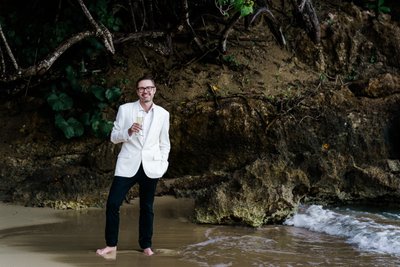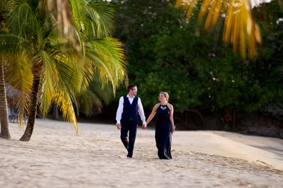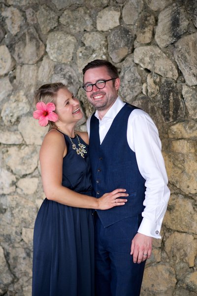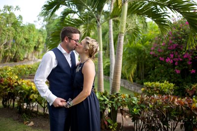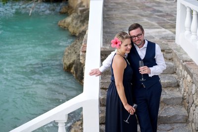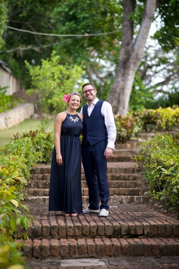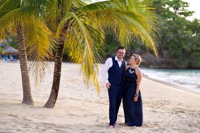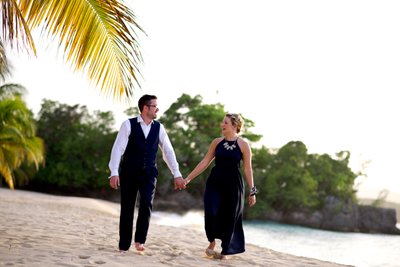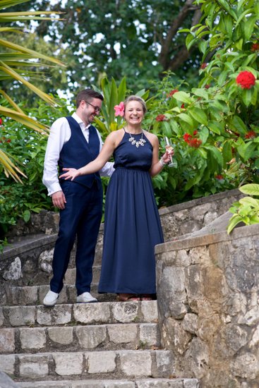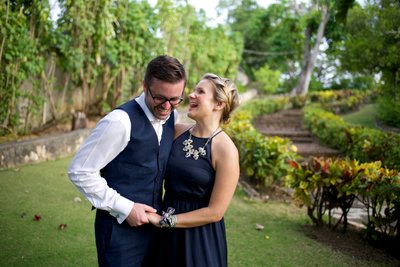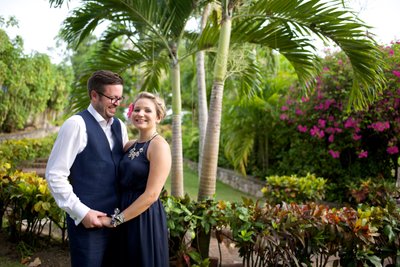 The first session began in the early evening, when the Jamaican sun still held warmth but the light had softened to something flattering and cinematic. Xenia arrived in a flowing navy halter maxi dress, a vibrant pink hibiscus flower tucked into her hair — a small but perfectly chosen nod to the tropics. Justin complemented her effortlessly in a navy vest, crisp white shirt, and sand-coloured loafers, the whole ensemble landing somewhere between relaxed sophistication and classic resort style.