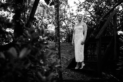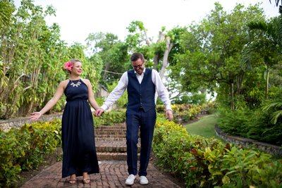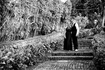 From the stable doors, the couple moved into Jamaica Inn's terraced gardens — a winding landscape of mossy brick steps, low stone walls, and dense tropical foliage. The black-and-white image of the two of them pausing on those steps, framed by bamboo groves and broad-leafed plants, has an almost editorial quality. The soft grain of the conversion strips away distraction and draws the eye directly to their posture: close, comfortable, smiling in the easy way that comes only between people who truly know each other.