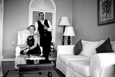 One of the most quietly compelling images from the first evening was taken inside one of Jamaica Inn's signature suites. Shot in black and white, it shows Xenia seated in a white wingback chair — champagne glass held loosely, relaxed and luminous — while Justin stands behind her, hand resting on her shoulder, gazing off with a composed, almost aristocratic expression. The arched plantation shutters behind them, the framed botanical print on the wall, and the white slipcovered sofa in the foreground give the scene an atmosphere that feels both intimate and cinematic. It is one of the most sophisticated frames of the entire collection.