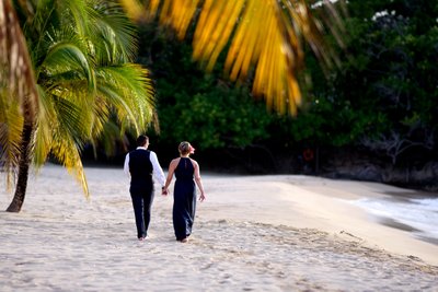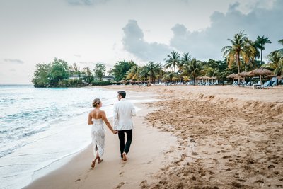 The final images from the second evening were taken on Jamaica Inn's private beach as dusk settled over the Caribbean. Shoes off, feet in the sand, Xenia and Justin walked hand in hand along the shoreline as the turquoise water lapped beside them. One image, taken from behind, follows their footprints in the wet sand as the couple moves toward the tree-covered headland in the distance — a genuinely poetic frame that says everything about shared direction and shared lives.