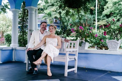 The second shoot opened on Jamaica Inn's distinctive blue veranda — a covered outdoor space framed by white columns and overlooking the hotel's manicured grounds. A white garden bench provided the perfect perch for a seated portrait, with cascading bougainvillea in vivid magenta blooming just behind them. Xenia leans toward the camera with confident warmth; Justin sits close behind her, arm resting across the bench back, smiling easily. The combination of the deep blue porch, the white architectural details, and the burst of tropical flowers makes this one of the most visually striking portraits of the entire collection.