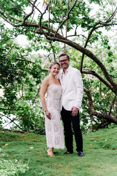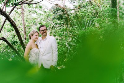 Moving deeper into the grounds, the pair posed among the trees in a frame that required real compositional confidence from the photographer. Shot through a foreground blur of tropical foliage — a hanging rope hammock visible to the right — the couple stands at the centre of the frame, arms around each other, smiling with a quiet contentment that reads as completely authentic. The dappled light through the overhead canopy creates a softness that flatters both the subjects and the white of their outfits. It is an image that rewards a second look.