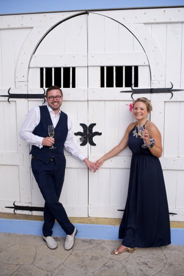 They opened the session in front of Jamaica Inn's iconic white stable doors — a striking architectural feature with heavy black iron hinges and an arched frame that photographs beautifully against a blue sky. Champagne flutes in hand, holding each other's gaze and laughing between sips, they looked every bit the couple on a celebratory escape. The image is bold and joyful, an immediate signal of what the whole shoot would deliver: warmth, connection, and a lightness that cannot be manufactured.