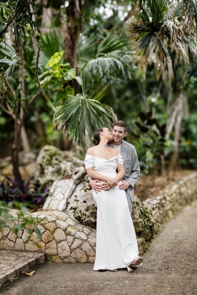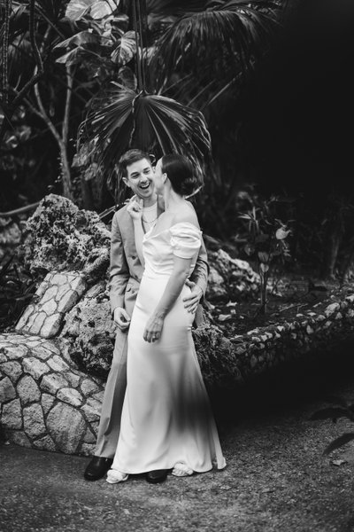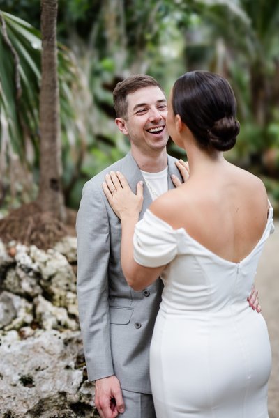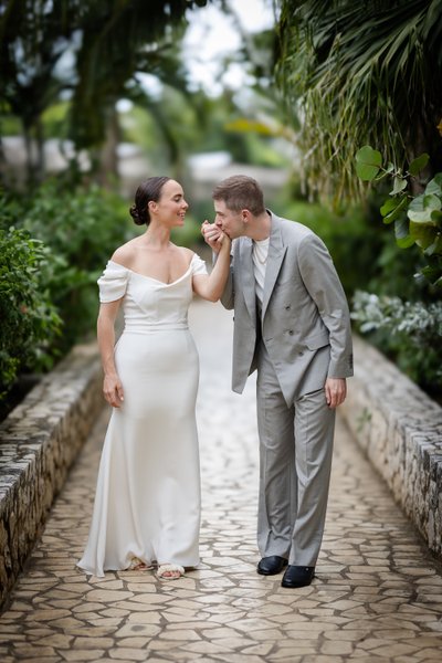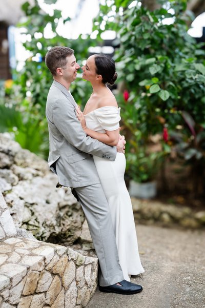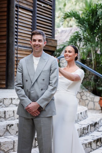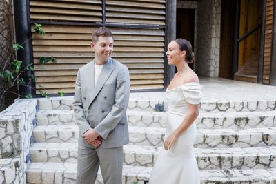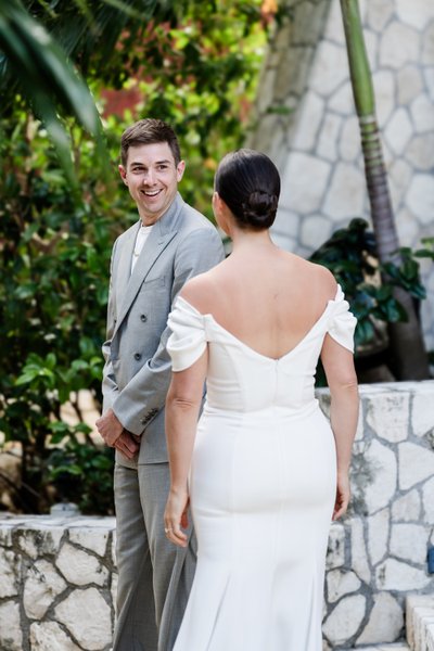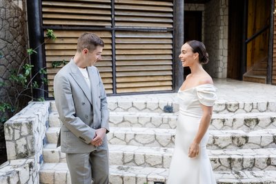 The morning of the wedding began with what photographers often call "the first look" — that private moment when the couple sees each other for the first time on their wedding day, before the ceremony. For Anna and Mike, this took place on the stone steps outside Rockhouse Hotel, framed by the hotel's distinctive wooden louvred shutters and lush tropical greenery.